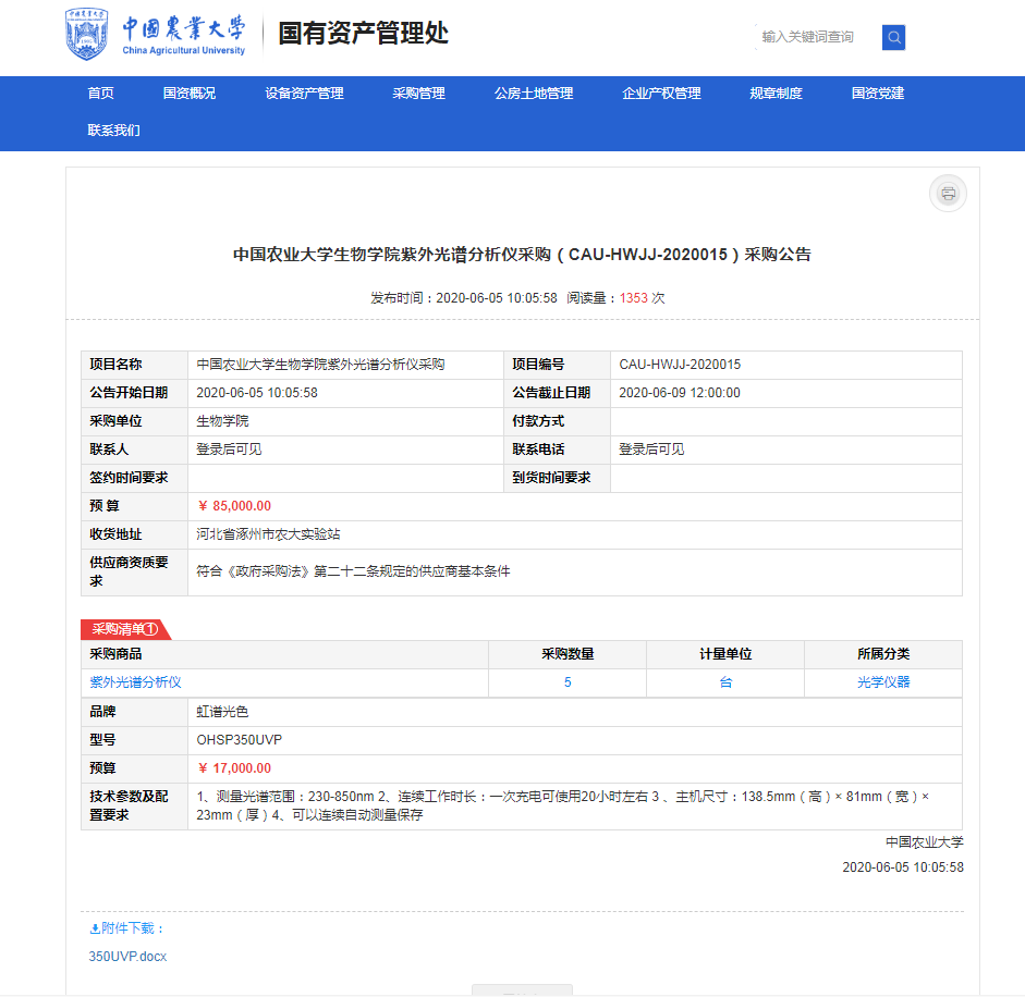 [喜訊]OHP350UVP紫外光譜分析儀成功中標(biāo)中國(guó)農(nóng)業(yè)大學(xué)生物學(xué)院專(zhuān)用設(shè)置采購(gòu)項(xiàng)目