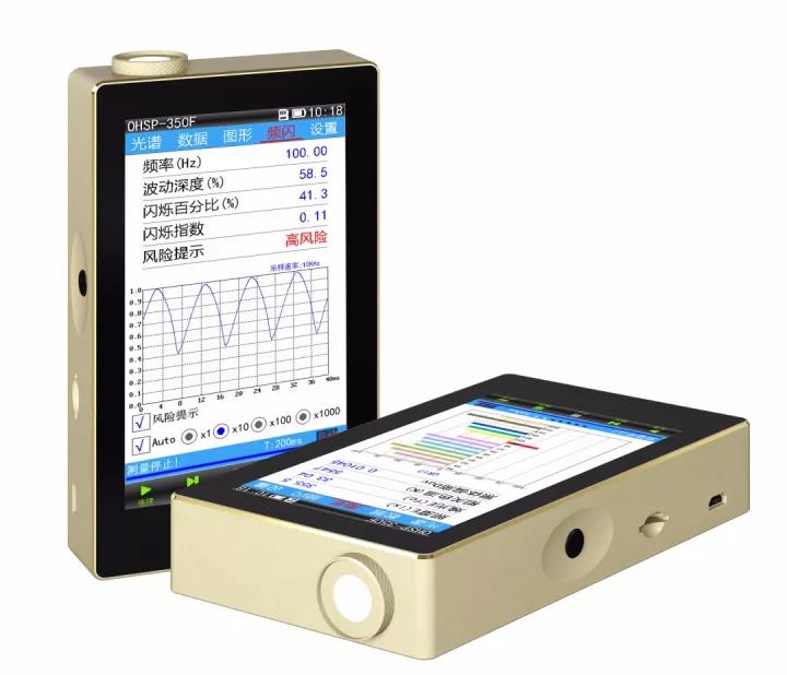 OHSP350F 光譜閃爍照度計(jì)專用于現(xiàn)場光譜測量和光源燈具閃爍分析譜閃爍照度計(jì)。250KHz高速采樣,用于測量瞬變光源,快速光度變化曲線光源、照明現(xiàn)場的快速測試,燈具閃爍、閃爍指數(shù)、光度變化曲線、頻閃、波動指數(shù)(頻閃指數(shù),F(xiàn)LICKER)、閃爍百分比(Percent Flicker)等的測量。具備頻閃測量和光譜測量的手持式儀器,但偏重于頻閃數(shù)據(jù)的分析,可獨(dú)立使用即測即得也可以連接PC 光源頻閃測量頻閃次數(shù)、頻率、頻閃區(qū)域波形。
