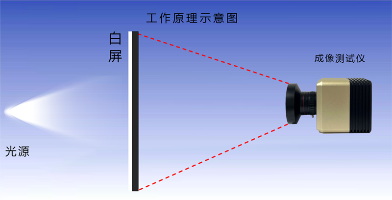 反射式應(yīng)用:光源照射到標(biāo)準(zhǔn)白屏上,成像亮度計(jì)測(cè)量并分析計(jì)算白屏上的照度分布。