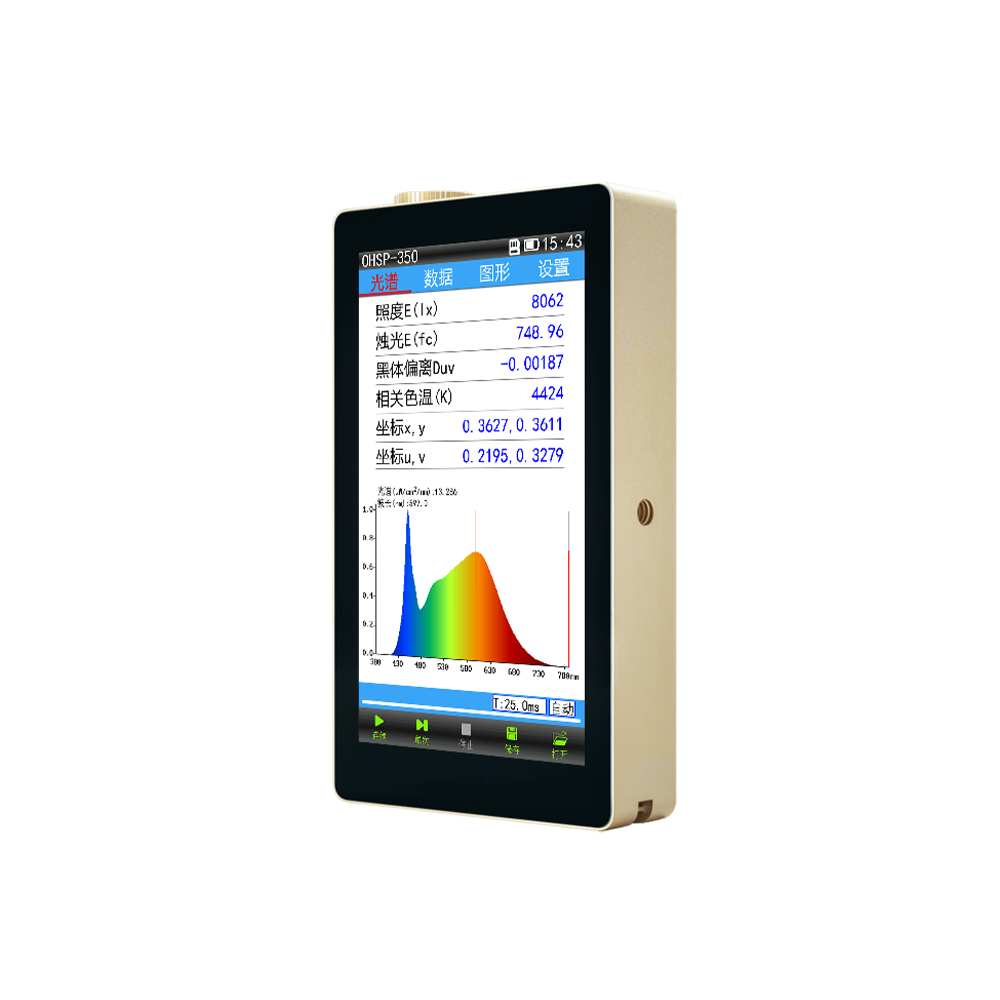 OHSP-350C集光譜、照度、色溫、顯色指數(shù)、R9、波長、輻照度、 色坐標、色容差、等測量功能參數(shù)于一體。采用5英寸大屏 ,各測量參數(shù)及曲線實時顯示 ,使用方便快捷??蓽y量LED等寬光譜光源 、也可以測量家用和商用照明燈具、護眼臺燈、教室燈具、 高低壓鈉燈HID等窄光譜的光源。