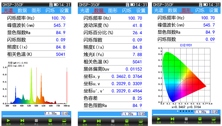 350F集光譜、照度、色溫、顯色指數(shù)、R9、波長、輻照度、 色坐標(biāo)、色容差、等測量功能參數(shù)于一體。 采用5英寸大屏 ,各測量參數(shù)及曲線實(shí)時(shí)顯示 ,使用 方便快捷??蓽y量LED等寬光譜光源、也可以測量 家用和商用照明燈具、護(hù)眼臺(tái)燈、教室燈具、高低 壓鈉燈HID等窄光譜的光源。