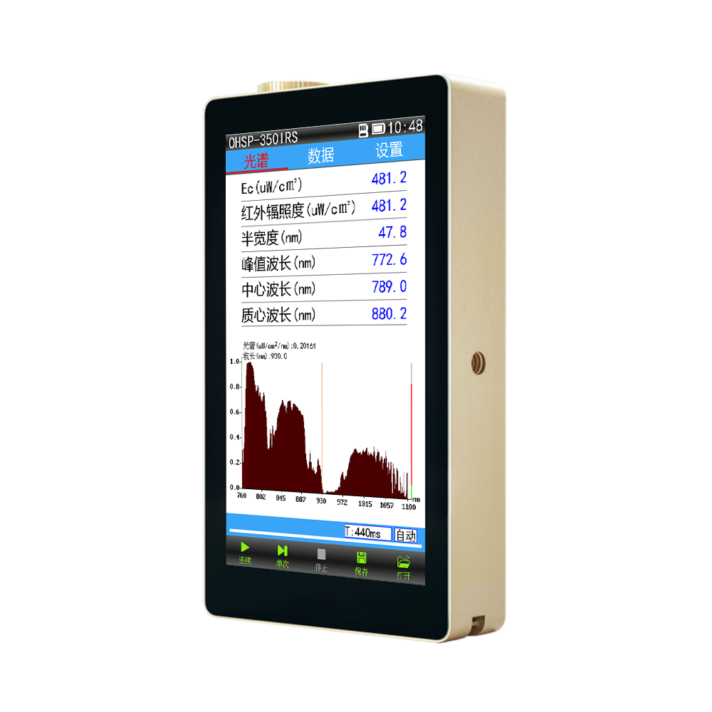 350IRS集光譜、波長(zhǎng)、紅外輻照度、半寬度、自定義波段輻照度等測(cè)量功能參數(shù)于一體。采用5英寸大屏,各測(cè)量參數(shù)及曲線實(shí)時(shí)顯示,使用方便快捷。專用于測(cè)量紅光及紅外光波段的輻照度和波長(zhǎng)的測(cè)量,紅外夜視監(jiān)控、紅外遙控發(fā)射管、紅外激光等的測(cè)量