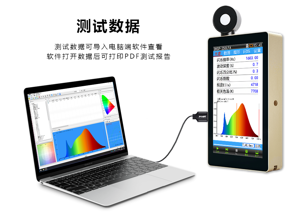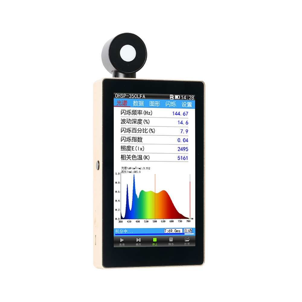 OHSP-350LFA集光譜、照度、色溫、顯色指數(shù)、頻閃、閃變指數(shù)Pst、頻閃效應(yīng)可視度SVM、R9、 長、輻照度、色坐標(biāo)、色容差、等測量功能參數(shù)于一體。采用5英寸大屏,各測量參數(shù)及曲線實(shí)時(shí)顯示,使用方便快捷。可測量LED等寬窄光譜源、也可以測量全光譜護(hù)眼臺燈、教室照明燈具等照明產(chǎn)品,符合IEEEStd1789 CIESVM IECPst ASSIST頻閃參數(shù)評估。